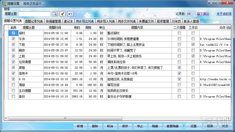 定时提醒+任务功能:软件能在您指定的时间用人声播报或自定义的铃声的方式提醒您想要做的事甚至帮您完成您需要做的任务。如:备份文件,清理垃圾,整点报时,生日提醒等。针对有一些时常需要做的事情,如在公司中写周报月报。自定义快捷键功能:您可以指定快捷键来调用自己常用的目录,文件,打开常用网址,复制信息等。如:使用ALT+Q打开QQ,使用ALT+M复制常用的信息到剪贴板,使用ALT+W打开常用网址。针对现在上班族安装的软件越来越多,所建的文件夹也越来越多,且目录越来越深,打开一个文件夹不方便,这边可以定义一些快捷键迅速打开目录或应用程序。